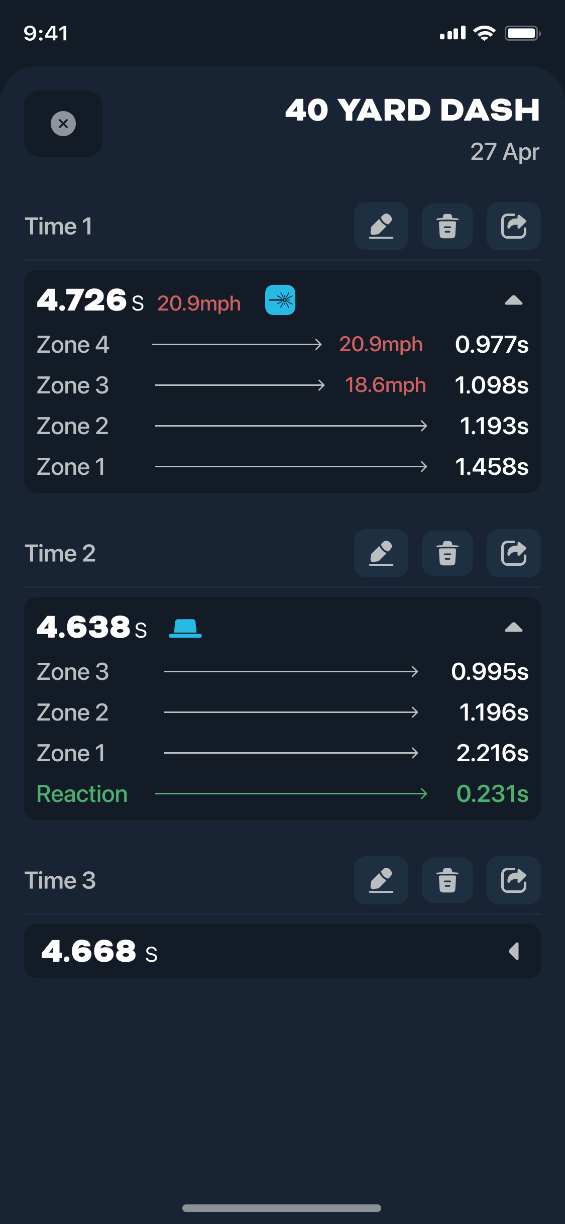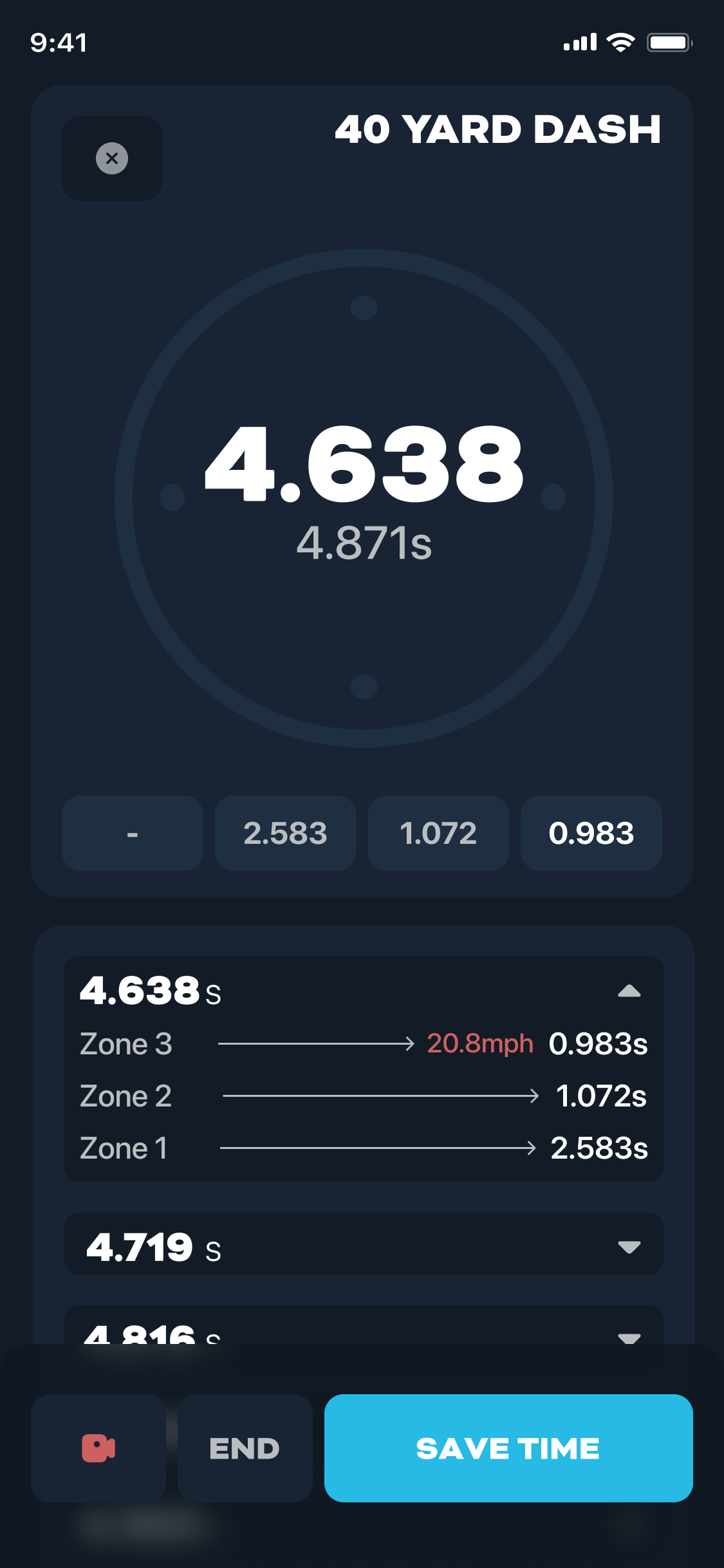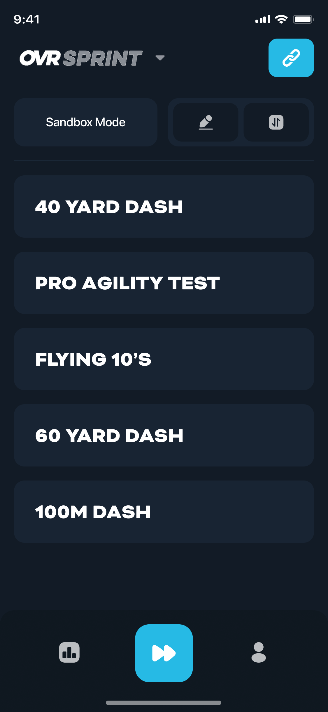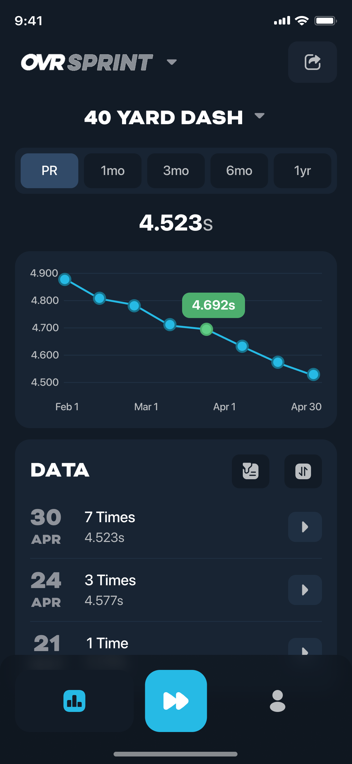 Time any straight line sprint – 40 yard, 60 yard, 100 meters and beyond. Use OVR Sprint at the start and finish, with optional splits in between.